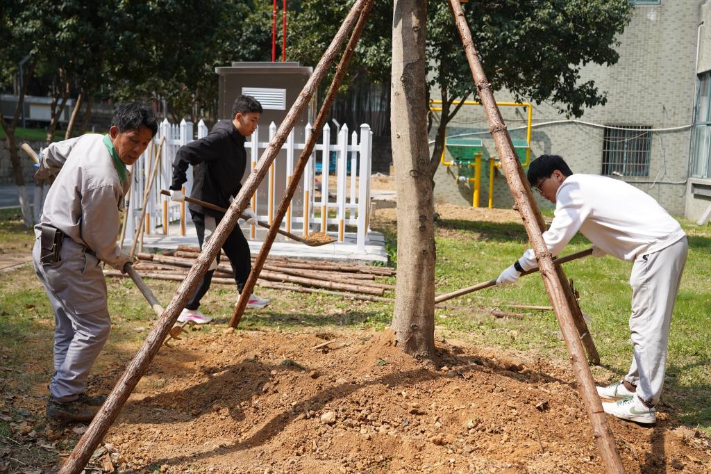 活动现场,师生们分组协作、分工明确,搬运树苗、挥锹培土、围堰灌溉,每一个环节都有条不紊,现场一派热火朝天的景象。大家共同栽种樱花、红枫、无患子等新苗,一锹土、一株苗,许下守护生态、共建美丽校园的美好约定。